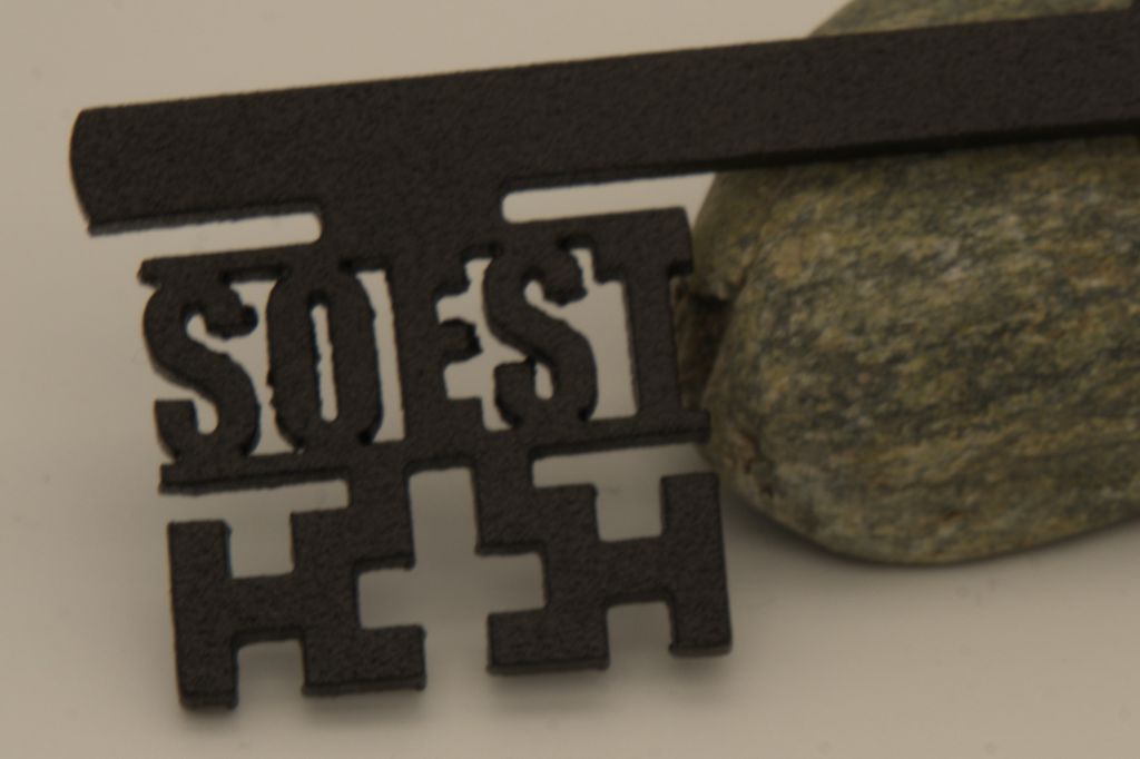 Dieser SOEST Schlüsselanhänger ist aus 3mm Aluminium gefertigt und ist schwarz gepulvert worden. Er hat einen Kordel aus grobem Band und auf der Rückseite ein kräftiger Magnet, so kann der Schlüssel an den Kühlschrank oder die Pinnwand kommen !