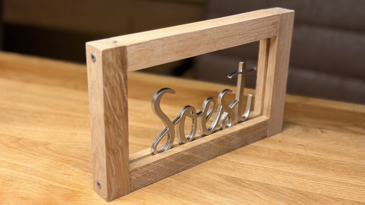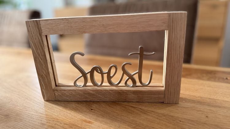 Soester Schriftzug im Eichenrahmen – modernes Design mit regionalem Herzstück.