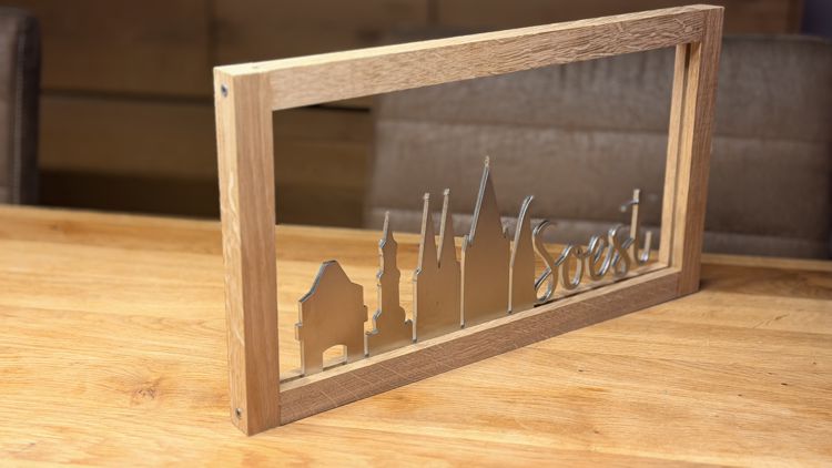 Soester Skyline im Eichenrahmen – modernes Design mit regionalem Herzstück.